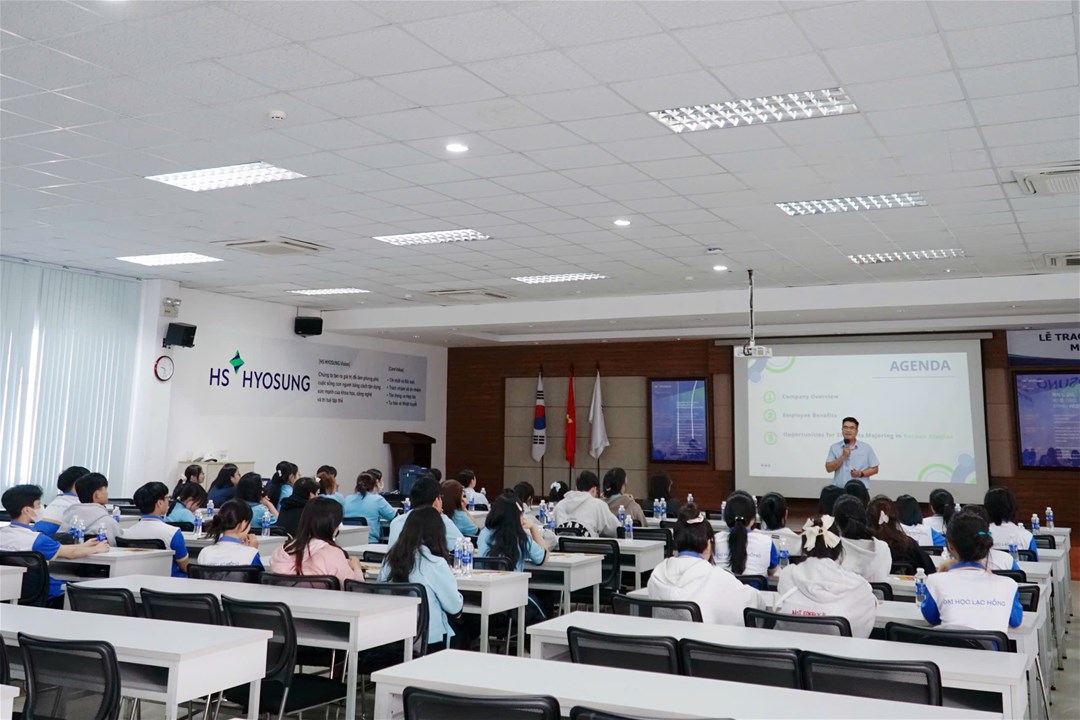 Trong khuôn khổ buổi tham quan, Lãnh đạo bộ phận nhân sự của công ty đã có buổi giao lưu, chia sẻ thân mật với các bạn sinh viên. Tại đây, các bạn sinh viên được giới thiệu tổng quan về quá trình hình thành – phát triển của Hyosung, văn hóa doanh nghiệp Hàn Quốc, môi trường làm việc đa quốc gia cũng như nhu cầu tuyển dụng nhân sự biết tiếng Hàn trong thời gian tới. Phía công ty cũng bày tỏ sự quan tâm và đánh giá tích cực đối với sinh viên ngành Hàn Quốc học Trường Đại học Lạc Hồng.
