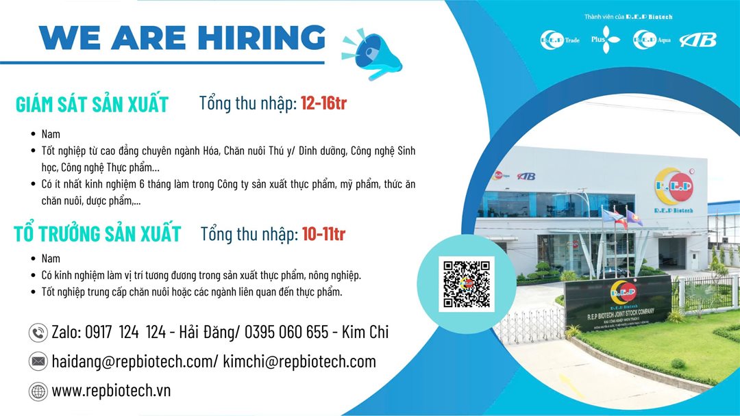 CÔNG TY R.E.P BIOTECH tuyển dụng nhân viên quản lý sản xuất ngành Công nghệ thực phẩm