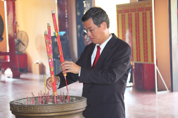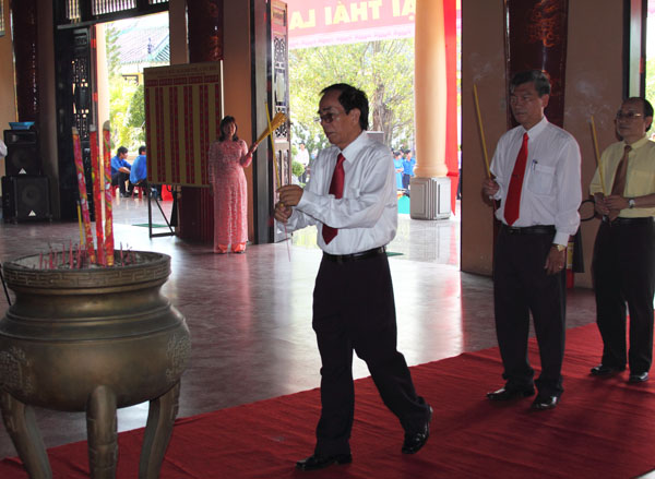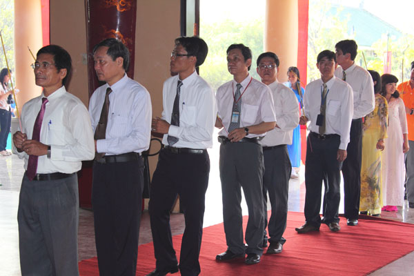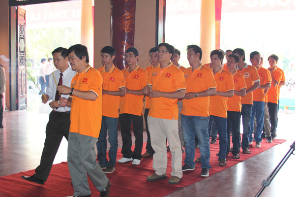 Leaders of Dong Nai province, teachers, and Robocon team offer incense at Tran Bien Temple of Literature.