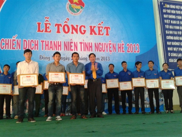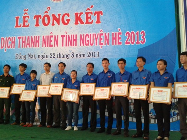 The same day's afternoon, at 14:00 p.m, LHU voluntary youth members together with 800 young people of other units gathered at Dong Nai University to attend the closing ceremony of 2013 Green Summer Campaign. At the closing ceremony, Dong Nai provincial Youth Union Standing Committee presented certificates of merit to LHU collective and two individuals including team leader Huynh Thuc Hieu and deputy leader Nguyen Ca Thuan.