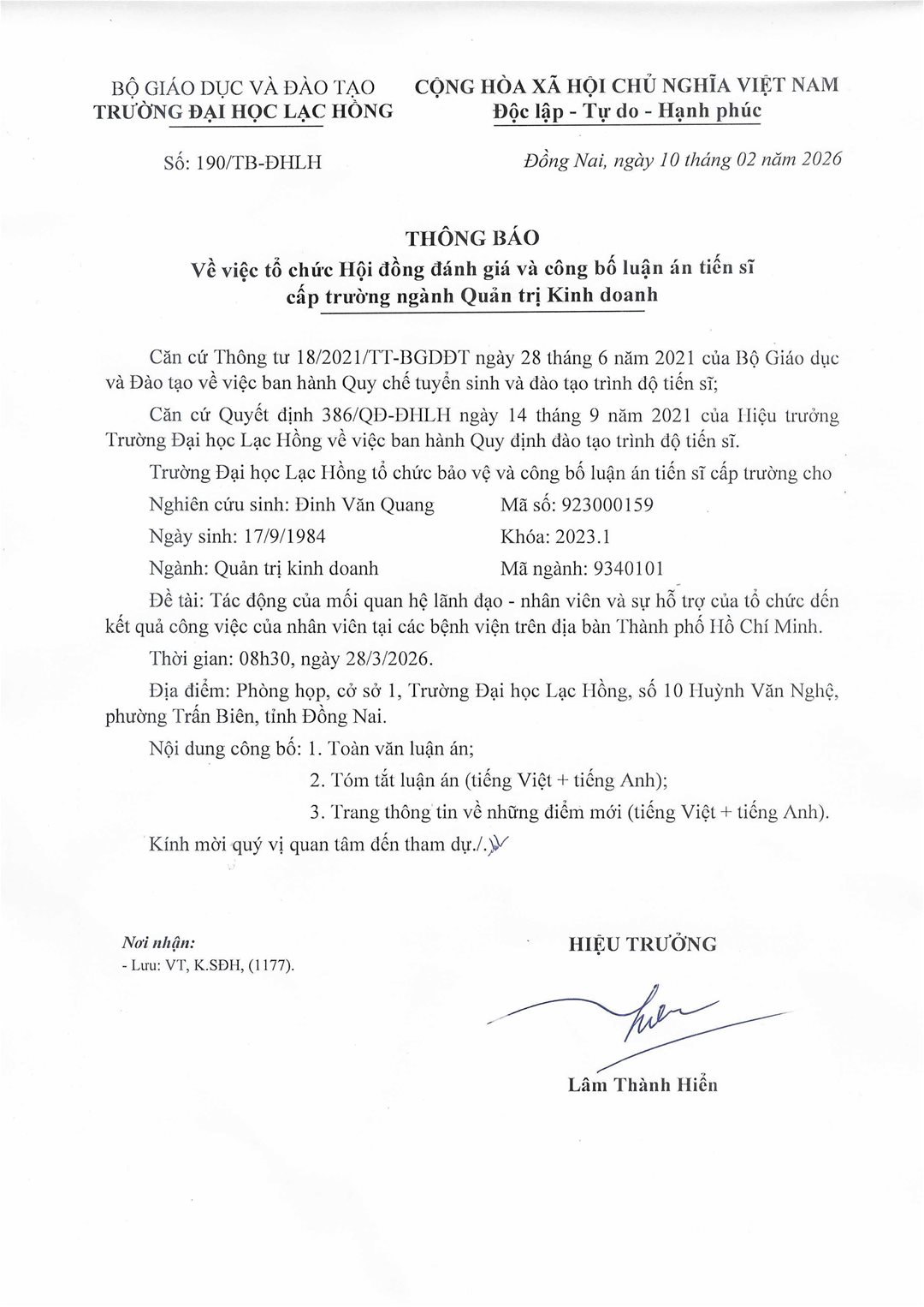 Thông báo lịch bảo vệ luận án tiến sĩ cấp Trường ngành Quản trị kinh doanh - NCS Đinh Văn Quang tháng 03 năm 2026